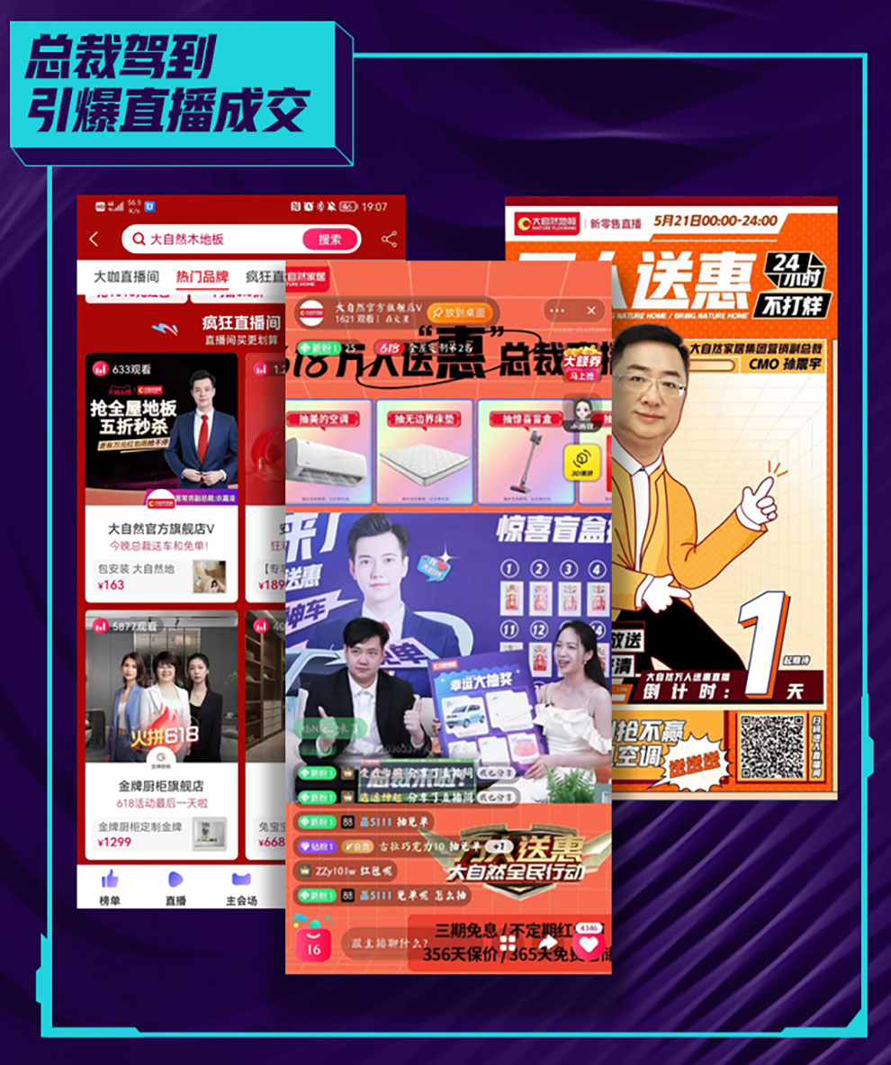 公司總裁直播送福利。大自然家居集團常務副總裁佘嘉浚先生、首席營銷官孫震宇先生到直播間,為觀眾送上特別福利:抽盲盒、整點紅包、大屏抽獎、紅包雨,甚至送出五菱宏光、美的空調(diào)、大自然床墊等大獎,引爆了直播間。
