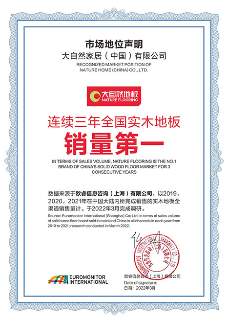 2022年3月,歐睿信息咨詢公司發(fā)布的市場調(diào)研報(bào)告顯示,在中國大陸市場全渠道銷量中,大自然實(shí)木地板從2019年至2021年,連續(xù)三年銷量第一。