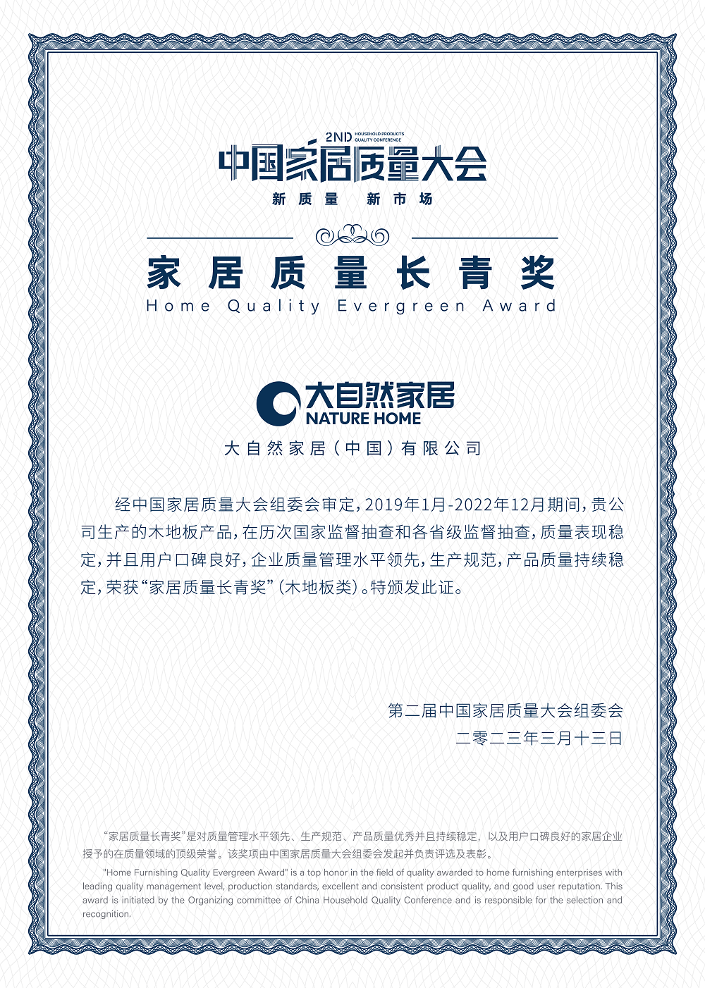 2023年3月13日,在3·15消費者權(quán)益日來臨之際,沸騰質(zhì)量數(shù)據(jù)聯(lián)合紅星美凱龍,以及家居相關(guān)行業(yè)協(xié)會、質(zhì)檢/認證機構(gòu)、家居品牌企業(yè)、家居上下游產(chǎn)業(yè)鏈企業(yè)、集采平臺、主流媒體等,以“新質(zhì)量 新市場”為主題,重磅舉辦《第二屆中國家居質(zhì)量大會》。在此次重量級活動上,大自然家居榮獲“家居質(zhì)量長青獎”,產(chǎn)品金風玉露地板獲得“沸騰質(zhì)量金獎”,再次向業(yè)內(nèi)人士和消費者展現(xiàn)了自己的產(chǎn)品質(zhì)量。