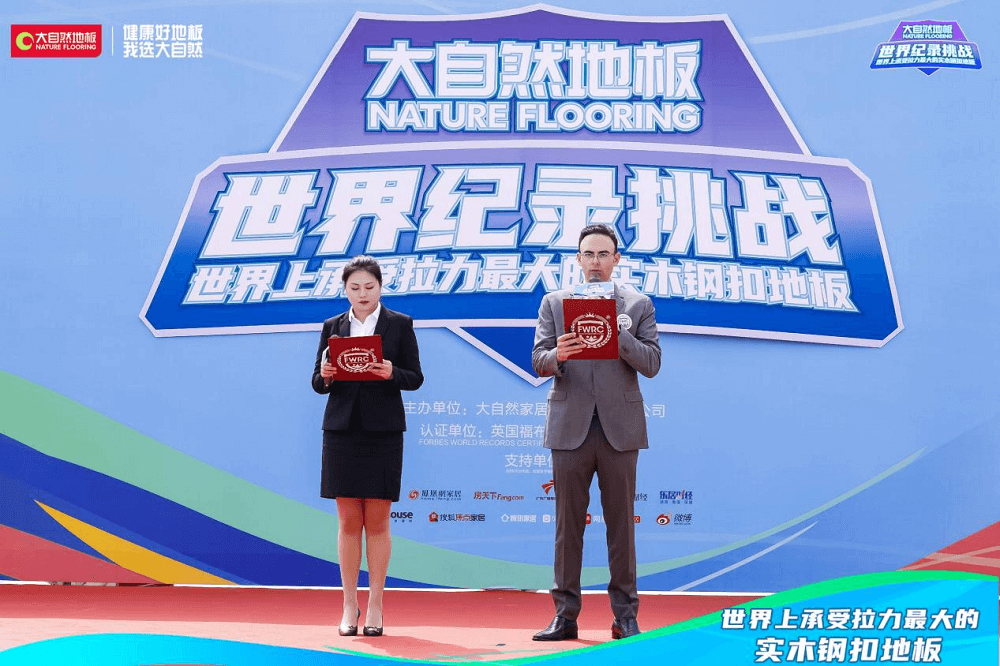經(jīng)福布斯世界紀(jì)錄認(rèn)證官方機(jī)構(gòu)認(rèn)證官現(xiàn)場(chǎng)記錄并宣布:大自然實(shí)木鋼扣地板最大的承受拉力為12806N,世界上承受拉力最大的實(shí)木鋼扣地板——大自然地板世界紀(jì)錄挑戰(zhàn)成功。隨后,在全體嘉賓、媒體、現(xiàn)場(chǎng)觀眾和線上廣大消費(fèi)者的見(jiàn)證下,福布斯世界紀(jì)錄認(rèn)證官方機(jī)構(gòu)認(rèn)證官為大自然家居授予世界紀(jì)錄稱號(hào)獎(jiǎng)牌,現(xiàn)場(chǎng)掌聲雷霆,歡呼爆發(fā)。