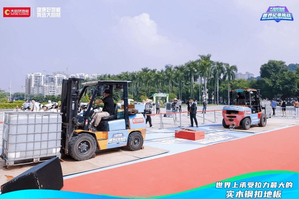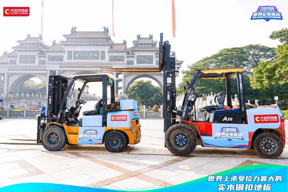 金秋十月,順?lè)屣h香。在萬(wàn)眾期盼中,大自然地板攜手福布斯FWRC世界紀(jì)錄認(rèn)證機(jī)構(gòu),發(fā)起的“世界上承受拉力最大的實(shí)木鋼扣地板”世界紀(jì)錄挑戰(zhàn)活動(dòng),在亞洲最大的牌坊——佛山順德順?lè)迳焦珗@牌坊盛大開(kāi)啟。當(dāng)天早上,兩輛重量高達(dá)5噸的叉車擺好“陣勢(shì)”,引來(lái)現(xiàn)場(chǎng)觀眾駐足觀看,線上直播同步進(jìn)行,組成線上打call團(tuán),共同見(jiàn)證。