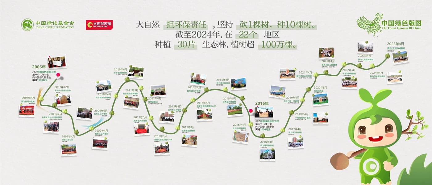 自“中國綠色版圖”工程啟動以來,大自然家居董事長佘學(xué)彬提出的“砍一棵樹,種10棵樹”理念在20年間持續(xù)踐行,以長期堅守為指引,積極推動行業(yè)走向商業(yè)向善的可持續(xù)發(fā)展道路,并帶動更多人加入守護環(huán)境、共創(chuàng)綠色未來的行列。