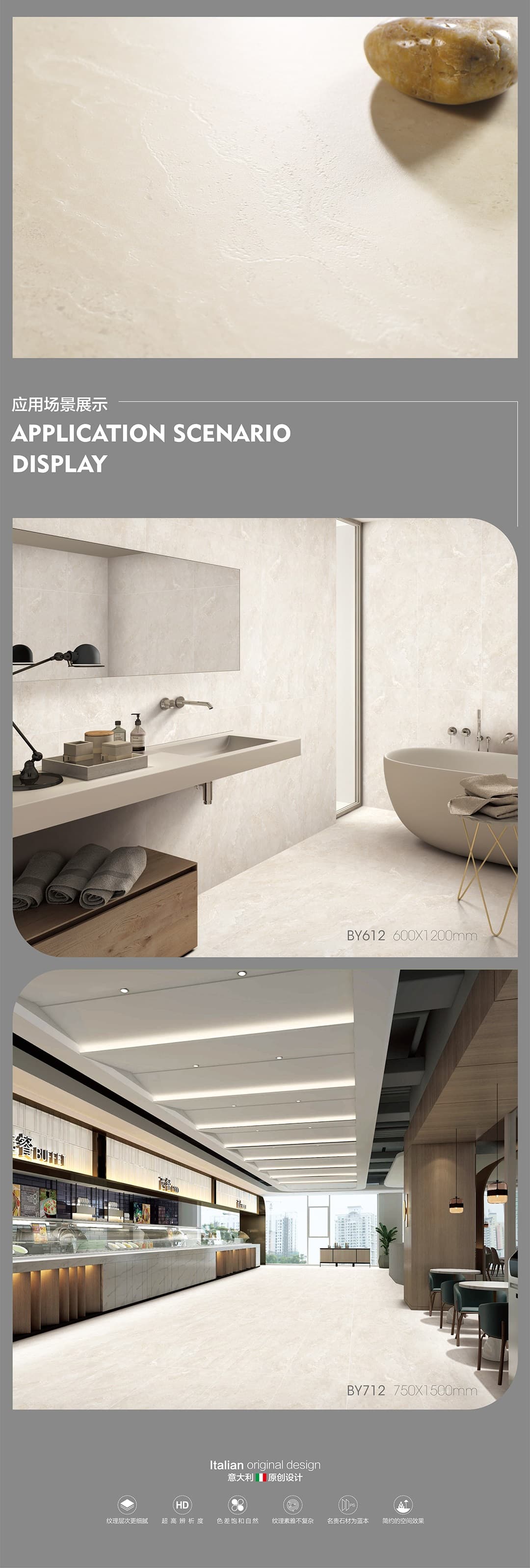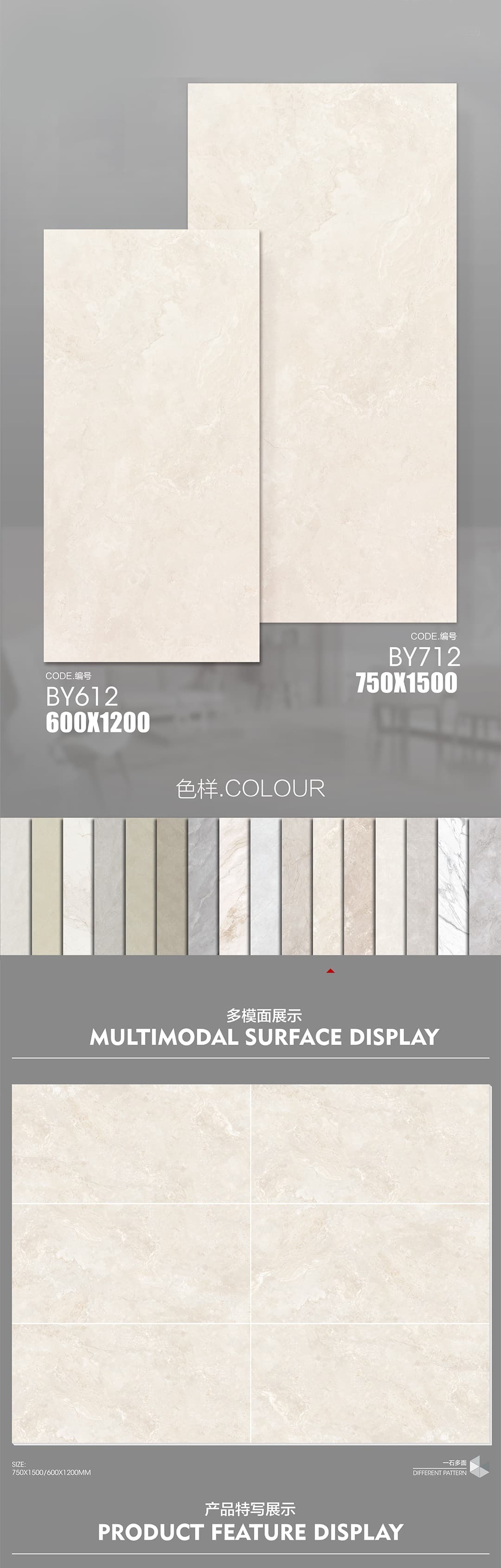 | 產(chǎn)品特性 | 表面柔和,防污效果強,防滑R10指標(biāo)高,抗折強度好 |