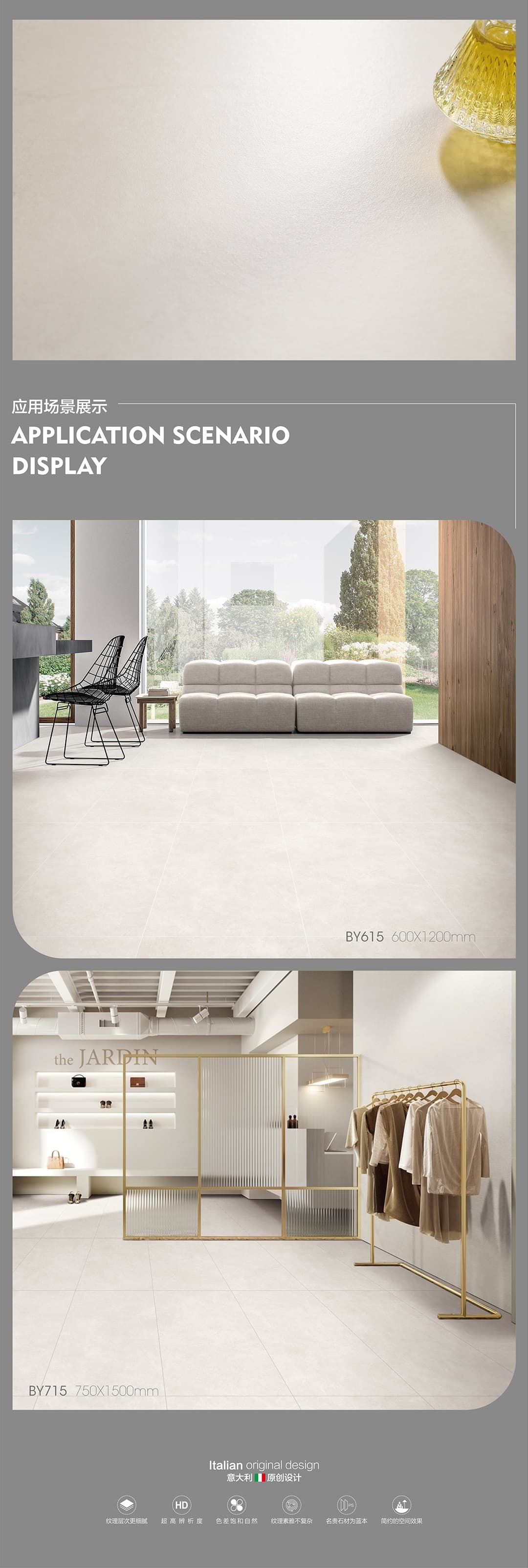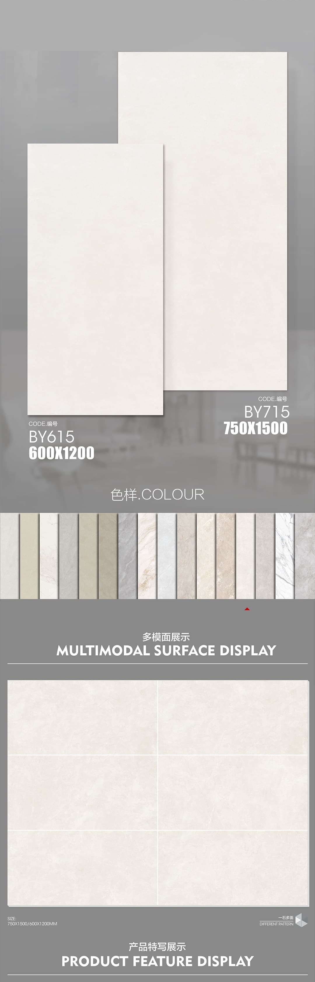 | 產(chǎn)品特性 | 表面柔和,防污效果強,防滑R10指標高,抗折強度好 |